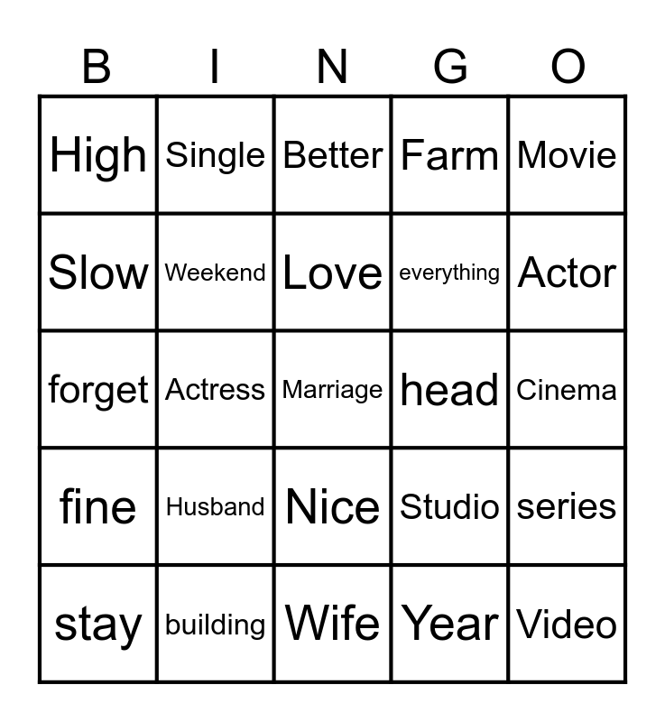 This bingo card has 25 words: Husband, Wife, Love, stay, Movie, High, Slow, Single, head, Nice, everything, forget, Studio, series, Weekend, Video, Cinema, Better, Actor, Actress, Marriage, building, fine, Farm and Year.