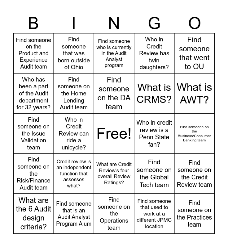 This bingo card has a free space and 24 words: Credit review is an independent function that assesses what?, Find someone that is an Audit Analyst Program Alum, Find someone on the DA team, What are the 6 Audit design criteria?, Find someone that went to OU, Find someone on the Product and Experience Audit team, Who has been a part of the Audit department for 32 years?, Find someone that was born outside of Ohio, Who in credit review is a Penn State fan?, What are Credit Review's four overall Review Ratings?, What is CRMS?, Find someone on the Issue Validation team, Find someone on the Global Tech team, Find someone on the Credit Review team, Find someone on the Home Lending Audit team, Find someone that used to work at a different JPMC location, Find someone on the Business/Consumer Banking team, Find someone who is currently in the Audit Analyst program, What is AWT?, Who in Credit Review can ride a unicycle?, Find someone on the Practices team, Find someone on the Risk/Finance Audit team, Who in Credit Review has twin daughters? and Find someone on the Operations team.