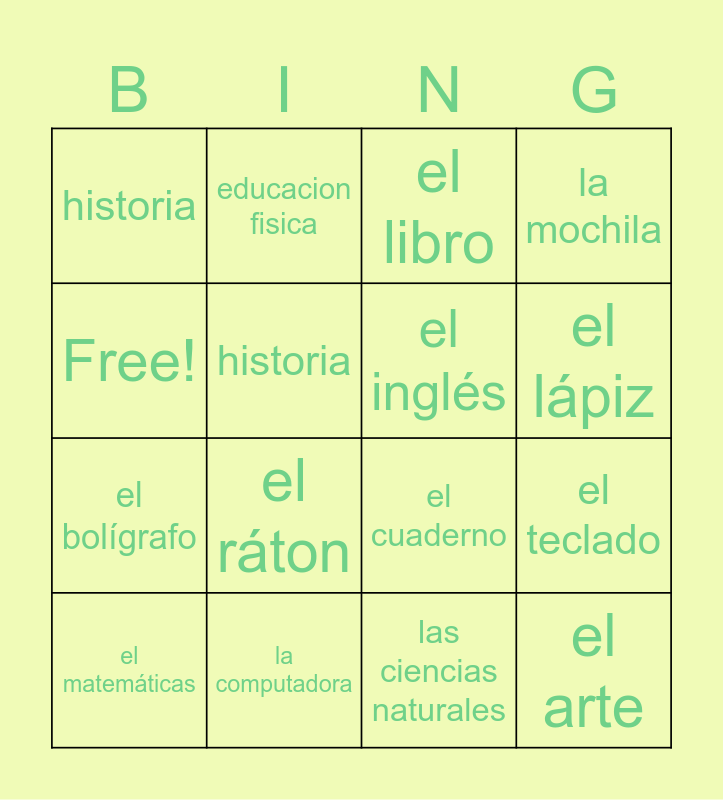 This bingo card has 16 words: la computadora, el teclado, el libro, historia, el bolígrafo, educacion fisica, el cuaderno, las ciencias naturales, Free!, historia, el matemáticas, la mochila, el ráton, el lápiz, el inglés and el arte.