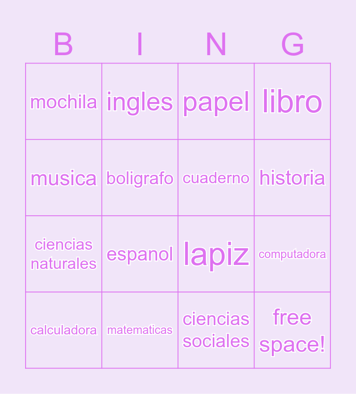 This bingo card has 16 words: matematicas, computadora, papel, mochila, ciencias naturales, ingles, lapiz, ciencias sociales, musica, boligrafo, calculadora, libro, espanol, historia, cuaderno and free space!.