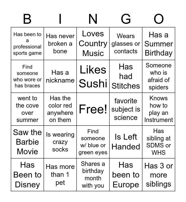 This bingo card has a free space and 24 words: Has Been to Disney, Is wearing crazy socks, Likes Sushi, Has been to Europe, Has a Summer Birthday, Has been to a professional sports game, Has never broken a bone, Loves Country Music, favorite subject is science, Knows how to play an Instrument, went to the cove over summer, Has a nickname, Is Left Handed, Has sibling at SDMS or WHS, Find someone who wore or has braces, Has more than 1 pet, Shares a birthday month with you, Wears glasses or contacts, Someone who is afraid of spiders, Saw the Barbie Movie, Has the color red anywhere on them, Find someone w/ blue or green eyes, Has had Stitches and Has 3 or more siblings.