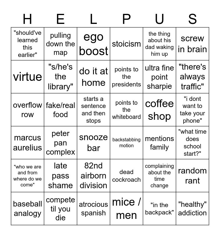 This bingo card has 36 words: dead cockroach, 82nd airborn division, mice / men, virtue, marcus aurelius, points to the whiteboard, "s/he's the library", atrocious spanish, the thing about his dad waking him up, complaining about the time change, "there's always traffic", stoicism, random rant, fake/real food, points to the presidents, "should've learned this earlier", "who we are and from where do we come", coffee shop, overflow row, ego boost, starts a sentence and then stops, peter pan complex, backstabbing motion, snooze bar, mentions family, pulling down the map, ultra fine point sharpie, compete til you die, do it at home, screw in brain, "healthy" addiction, baseball analogy, "what time does school start?", "i dont want to take your phone", late pass shame and "in the backpack".