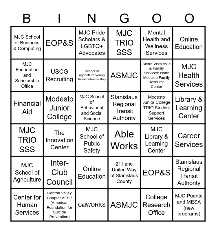 This bingo card has 57 words: Free!, MJC School of Public Safety, MJC School of Industry & Trades, MJC School of Business & Computing, MJC Library & Learning Center, MJC Language Arts and Education, MJC Foundation and Scholarship Office, Sports Medicine Club, School of agriculture/young farmers/leadership, Rise Up Center, MJC TRIO SSS, MJC Puente and MESA (new programs), EOP&S, 211 and United Way of Stanislaus County, MJC Career Services, Stanislaus Regional Transit Authority, Mental Health and Wellness Services, MJC Health Services, The L.E.A.F Company, Financial Aid, Modesto Junior College, Center for Human Services, MJC TRIO SSS, MJC Pride Scholars & LGBTQ+ Advocates, Accommodations and Support Center, USCG Recruiting, Online Education, Warriors on the Way - Stan State, ASMJC, Central Valley Chapter AFSP (American Foundation for Suicide Prevention), International Student Program, College Research Office, School of Science, Engineering & Math, Golden Valley Health Centers, MJC School of Behaviorial and Social Science, Online Education, The LEAF COMPANY, Sierra Vista child & Family Services: North Modesto Family Resource Center, RISE UP Center, Stanislaus Regional Transit Authority, EOP&S, Library & Learning Center, MJC School of Agriculture, Basic Needs Program, International Student Program, Modesto Junior College Puente Project, Modesto Junior College TRIO Student Support Services, Able Works, Transfer Center/Student Services, ASMJC, Inter-Club Council, Career Services, CalWORKS, Inter Club Council, City of Modesto, The Innovation Center and Pepsi Cola.