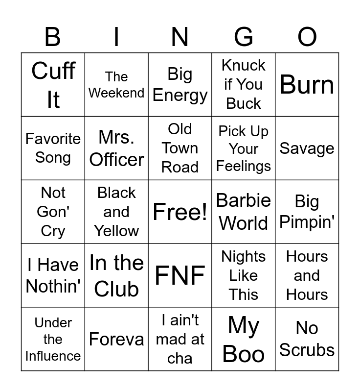 This bingo card has a free space and 24 words: In the Club, Foreva, Old Town Road, Under the Influence, Burn, Cuff It, Favorite Song, The Weekend, Barbie World, FNF, Pick Up Your Feelings, Not Gon' Cry, Nights Like This, Hours and Hours, Mrs. Officer, My Boo, Big Pimpin', Big Energy, Savage, Black and Yellow, No Scrubs, I Have Nothin', Knuck if You Buck and I ain't mad at cha.