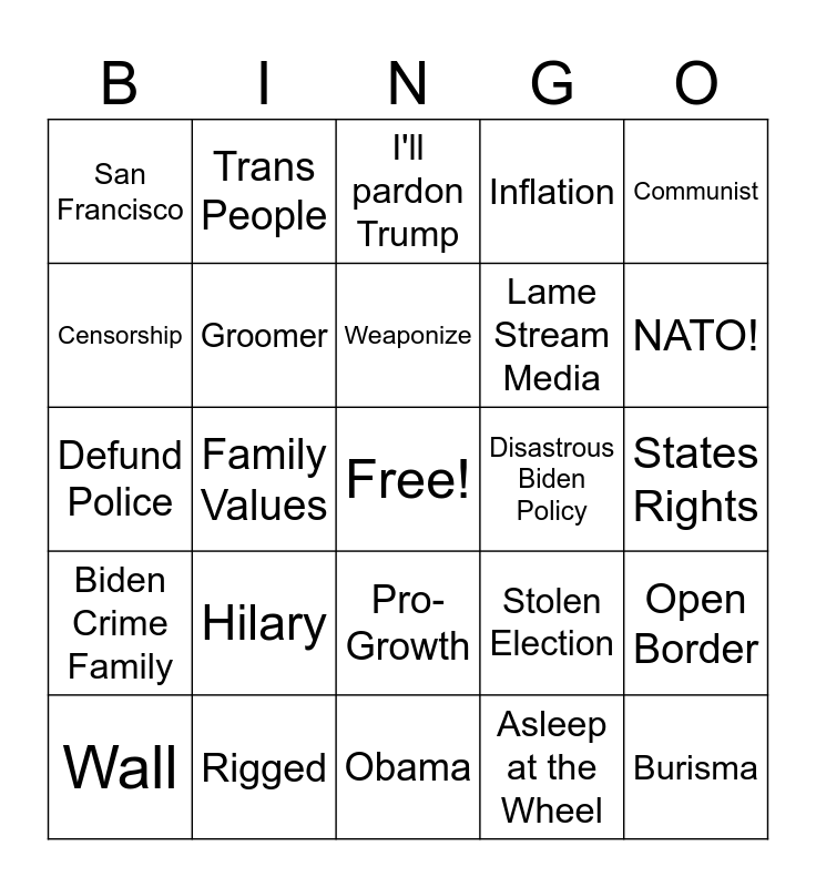 This bingo card has a free space and 35 words: Woke, Laptop, Socialist, Groomer, Pro-Growth, Inflation, Censorship, Election Fraud, Weaponize, Oil/Gas, Defund Police, Communist, Hunter, Protect Children, San Francisco, Disastrous Biden Policy, Asleep at the Wheel, Family Values, Biden Crime Family, Burisma, Stolen Election, Wall, Open Border, Rigged, I'll pardon Trump, NATO!, George Soros, Witch Hunt, Lame Stream Media, States Rights, Gun rights, Obama, Hilary, Trans People and Pardon Trump.