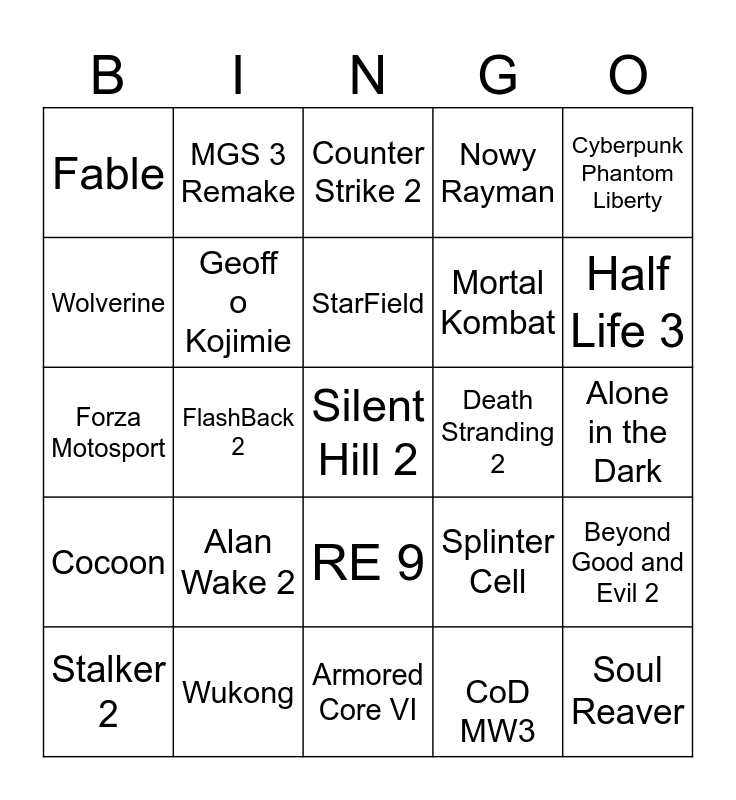 This bingo card has a free space and 24 words: Alan Wake 2, Wukong, StarField, Stalker 2, Cyberpunk Phantom Liberty, Fable, Wolverine, MGS 3 Remake, Death Stranding 2, RE 9, Mortal Kombat, Forza Motosport, Splinter Cell, Beyond Good and Evil 2, Geoff o Kojimie, CoD MW3, Alone in the Dark, Counter Strike 2, Half Life 3, FlashBack 2, Soul Reaver, Cocoon, Nowy Rayman and Armored Core VI.