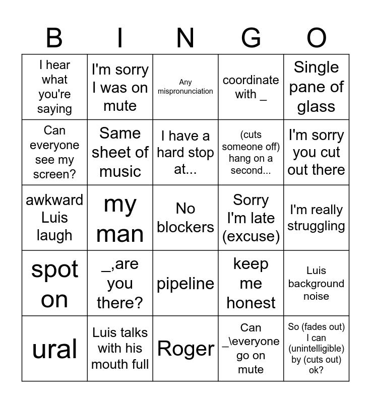 This bingo card has a free space and 53 words: Synergy, So (fades out) I can (unintelligible) by (cuts out) ok?, (child or animal noises), Can _\everyone go on mute, _,are you there?, Can we take this offline, I'm sorry I was on mute, (for over talkers), Sorry go ahead, Can everyone see my screen?, Luis Breaking the law, Same sheet of music, future state, Luis background noise, keep me honest, circle back, ural, I have a hard stop at..., Sorry I'm late (excuse), I think there's a disconnect here, Single pane of glass, my man, Sorry to interrupt, but -interrupts again anyway-, (cuts someone off) hang on a second..., I hear what you're saying, herculean effort, Luis talks with his mouth full, Hey, guys, I need to jump on another call, mEtRicS, KPIs, I'm sorry you cut out there, awkward silence, (luis referencing talking to marco), on the radar, Luis smoking anything, Luis camera goes on and off so he can take a hit, add this to the leadership meeting, coordinate with _, Roger, Any mispronunciation, (Someone has technical difficulties), can you pause there for a second, spearhead, I'm really struggling, we're at time, high level, pipeline, is this a blockers meeting?, complains about calendar, awkward Luis laugh, spot on, deep dive, references/shows Marco's goals and net new.
