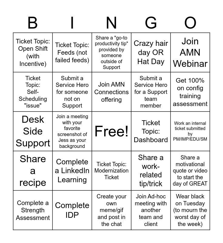 This bingo card has a free space and 24 words: Complete a LinkedIn Learning, Complete IDP, Join AMN Connections offering, Complete a Strength Assessment, Join AMN Webinar, Ticket Topic: Open Shift (with Incentive), Ticket Topic: Self-Scheduling "issue", Ticket Topic: Feeds (not failed feeds), Ticket Topic: Dashboard, Ticket Topic: Modernization Ticket, Submit a Service Hero for a Support team member, Desk Side Support, Share a work-related tip/trick, Share a motivational quote or video to start the day of GREAT, Submit a Service Hero for someone not on Support, Join Ad-hoc meeting with another team and client, Work an internal ticket submitted by PM/IMP/EDU/SM, Share a "go-to productivity tip" provided by someone outside of Support, Get 100% on config training assessment, Join a meeting with your favorite screenshot of Jess as your background, Wear black on Tuesday (to mourn the worst day of the week), Share a recipe, Crazy hair day OR Hat Day and Create your own meme/gif and post in the chat.