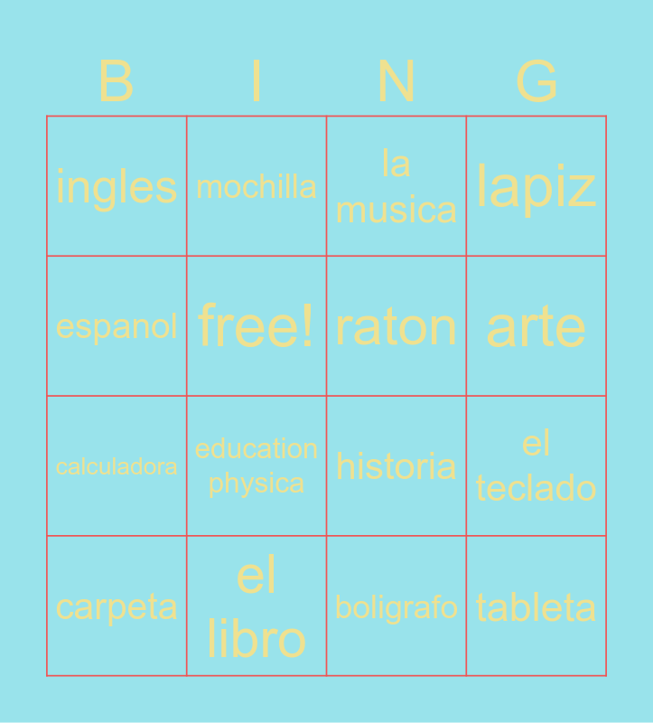 This bingo card has 16 words: el libro, el teclado, la musica, ingles, calculadora, mochilla, historia, boligrafo, espanol, free!, carpeta, lapiz, education physica, arte, raton and tableta.
