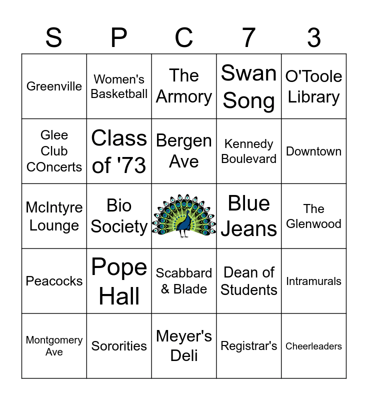 This bingo card has a free space and 74 words: Journal Square, President Yanitelli, The Armory, Rifle Team, Five Corners, Jules Restaurant, Westside Avenue, EDSO, Montgomery Ave, Noble Order, Gannon Debate, Pauw Wow, Bergen Ave, Glee Club COncerts, Student Senate, Bio Society, Roosevelt Stadium, Downtown, Sigma Pi Sigma, McIntyre Lounge, Class of '73, Women's Basketball, Swan Song, The Heights, Cheerleaders, Rankin Hall, Poli Sci Forum, Pi Mu Epsilon, Collins Chem, WSPC Radio, O'Toole Library, Fraternities, Argus Eyes, Cross Keys, Track, Registrar's, Fencing, Men's Basketball, Pershing Rifles, Peacock Pie, Meyer's Deli, Sororities, Ticketron, Pinochle League, Campus Ministry, Greenville, Mindscape, Pope Hall, The Lamp, Chess Club, The Pavan, Football, The Glenwood, Lincoln Park, Ski Club, Peahens, Scabbard & Blade, PATH trains, Admissions, Intramurals, Kennedy Boulevard, Hot Dog Man, Peacocks, Telephone Booth, Blue Jeans, Work Study, Baseball, McGinley Square, Dean of Students, Jesuits, Cushing Alum House, Soccer, Financial Aid and Parking.