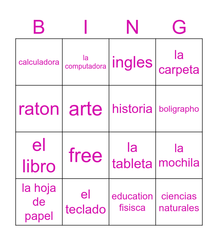 This bingo card has 16 words: el teclado, la mochila, ingles, calculadora, el libro, la computadora, la tableta, education fisisca, raton, arte, la hoja de papel, la carpeta, free, boligrapho, historia and ciencias naturales.