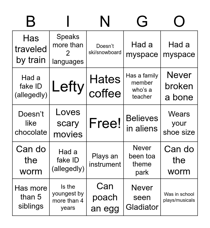 This bingo card has a free space and 27 words: Has more than 5 siblings, Is the youngest by more than 4 years, Hates coffee, Never seen Gladiator, Never broken a bone, Has traveled by train, Speaks more than 2 languages, Plays an instrument, Has a family member who’s a teacher, Was in school plays/musicals, Doesn’t like chocolate, Lefty, February birthday, Never been toa theme park, Wears your shoe size, Sleeps with childhood blanket/stuffed animal, Loves scary movies, Doesn’t ski/snowboard, Believes in aliens, Had a myspace, Can do the worm, Had a fake ID (allegedly), Can poach an egg, Had a myspace, Can do the worm, Had a fake ID (allegedly) and Can poach an egg.