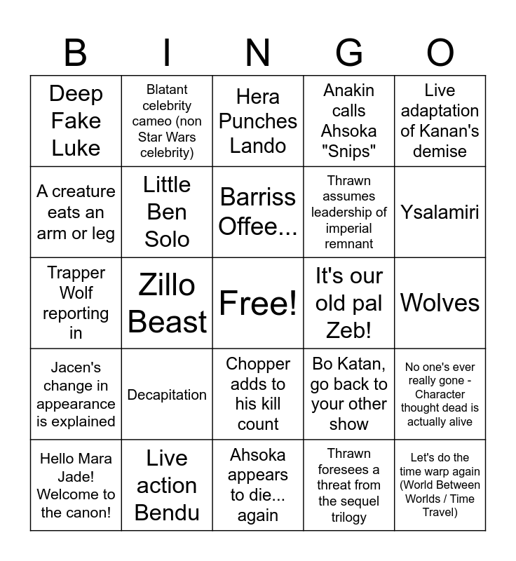 This bingo card has a free space and 29 words: Hello Mara Jade! Welcome to the canon!, Ezra and Thrawn UNITED?!, Zillo Beast, Deep Fake Leia, Deep Fake Luke, Hera Punches Lando, Little Ben Solo, Decapitation, It's our old pal Zeb!, Live action Bendu, Wolves, Let's do the time warp again (World Between Worlds / Time Travel), Ahsoka appears to die... again, Thrawn foresees a threat from the sequel trilogy, Ysalamiri, New Republic incompetence on display, Chopper adds to his kill count, Jacen's change in appearance is explained, Live adaptation of Kanan's demise, Trapper Wolf reporting in, Bo Katan, go back to your other show, Thrawn easily destroys a fleet of New Republic ships, Thrawn assumes leadership of imperial remnant, A creature eats an arm or leg, Anakin calls Ahsoka "Snips", Blatant celebrity cameo (non Star Wars celebrity), No one's ever really gone - Character thought dead is actually alive, Barriss Offee... and The main character will not be appearing in tonight's episode.