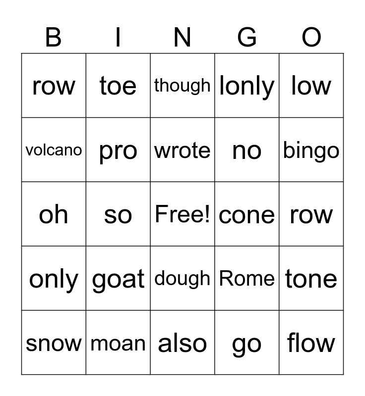 This bingo card has a free space and 24 words: goat, moan, wrote, snow, low, row, volcano, toe, cone, dough, no, oh, Rome, tone, pro, go, row, though, bingo, so, flow, only, lonly and also.