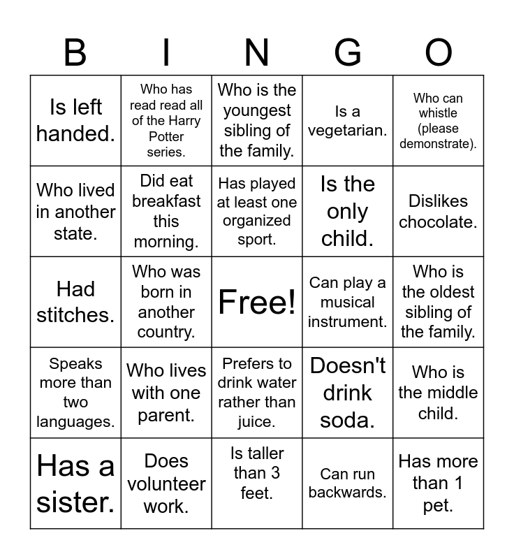 This bingo card has a free space and 24 words: Who lives with one parent., Does volunteer work., Has played at least one organized sport., Has a sister., Who can whistle (please demonstrate)., Is left handed., Who lived in another state., Who has read read all of the Harry Potter series., Can play a musical instrument., Prefers to drink water rather than juice., Is the only child., Had stitches., Doesn't drink soda., Who is the middle child., Did eat breakfast this morning., Can run backwards., Who is the oldest sibling of the family., Who is the youngest sibling of the family., Dislikes chocolate., Who was born in another country., Has more than 1 pet., Speaks more than two languages., Is a vegetarian. and Is taller than 3 feet..