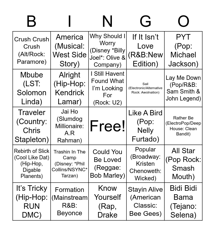 This bingo card has a free space and 24 words: Trashin In The Camp (Disney: *Phil Collins/NSYNC* Tarzan), Formation (Mainstream R&B: Beyonce, I Still Havent Found What I’m Looking For (Rock: U2), It’s Tricky (Hip-Hop: RUN DMC), PYT (Pop: Michael Jackson), Crush Crush Crush (Alt/Rock: Paramore), Mbube (LST: Solomon Linda), America (Musical: West Side Story), Like A Bird (Pop: Nelly Furtado), Could You Be Loved (Reggae: Bob Marley), Sail (Electronic/Alternative Rock: Awolnation), Traveler (Country: Chris Stapleton), Popular (Broadway: Kristen Chenoweth: Wicked), All Star (Pop Rock: Smash Mouth), Alright (Hip-Hop: Kendrick Lamar), Stayin Alive (American Classic: Bee Gees), Rather Be (ElectroPop/Deep House: Clean Bandit), Why Should I Worry (Disney *Billy Joel*: Olive & Company), Lay Me Down (Pop/R&B: Sam Smith & John Legend), Jai Ho (Slumdog Millionaire: A.R Rahman), Bidi Bidi Bama (Tejano: Selena), Rebirth of Slick (Cool Like Dat)(Hip-Hop, Digable Planents), If It Isn’t Love (R&B:New Edition) and Know Yourself (Rap, Drake.
