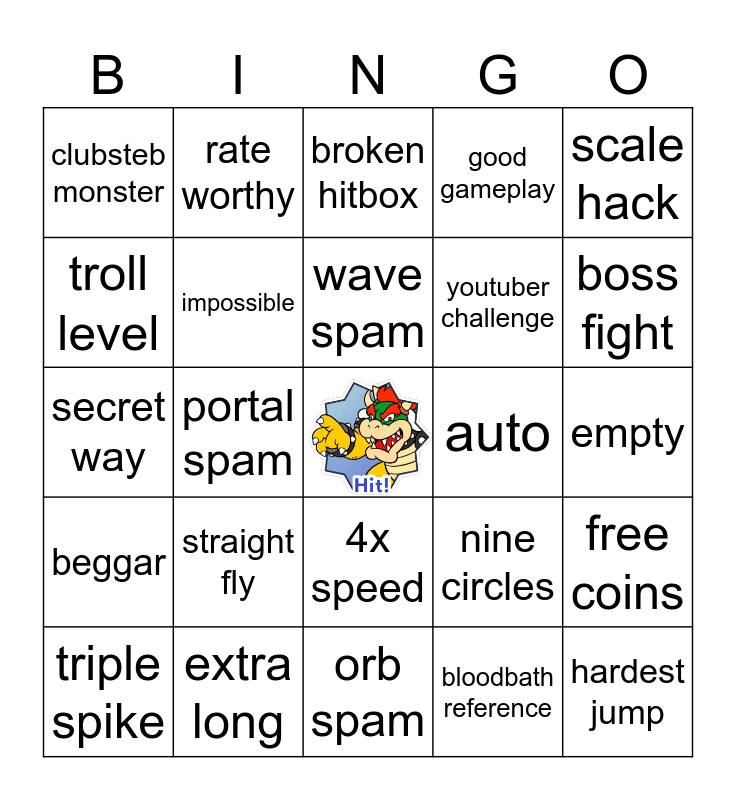 This bingo card has a free space and 25 words: straight fly, orb spam, wave spam, triple spike, scale hack, clubsteb monster, troll level, rate worthy, auto, 4x speed, youtuber challenge, secret way, nine circles, free coins, impossible, art, empty, broken hitbox, boss fight, portal spam, hardest jump, extra long, beggar, good gameplay and bloodbath reference.