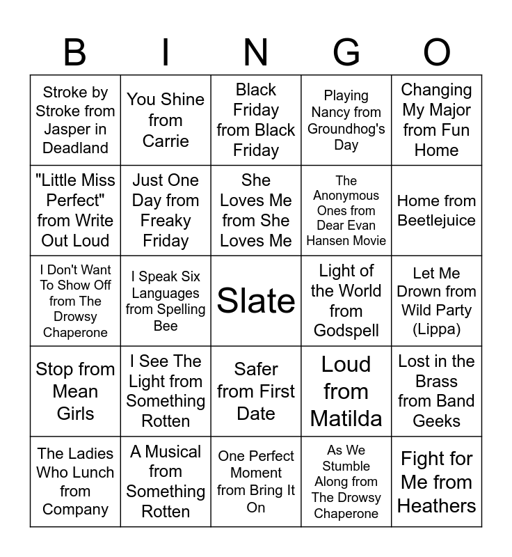 This bingo card has a free space and 24 words: I See The Light from Something Rotten, A Musical from Something Rotten, She Loves Me from She Loves Me, The Ladies Who Lunch from Company, Changing My Major from Fun Home, Stroke by Stroke from Jasper in Deadland, "Little Miss Perfect" from Write Out Loud, You Shine from Carrie, Light of the World from Godspell, Safer from First Date, The Anonymous Ones from Dear Evan Hansen Movie, I Don't Want To Show Off from The Drowsy Chaperone, Loud from Matilda, Lost in the Brass from Band Geeks, Just One Day from Freaky Friday, As We Stumble Along from The Drowsy Chaperone, Let Me Drown from Wild Party (Lippa), Black Friday from Black Friday, Home from Beetlejuice, I Speak Six Languages from Spelling Bee, Fight for Me from Heathers, Stop from Mean Girls, Playing Nancy from Groundhog's Day and One Perfect Moment from Bring It On.