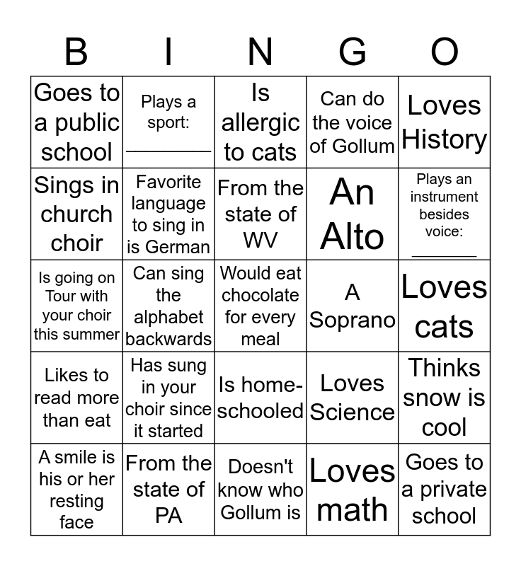 This bingo card has a free space and 24 words: Has sung in your choir since it started, From the state of PA, From the state of WV, A smile is his or her resting face, Loves History, Goes to a public school, Sings in church choir, Plays a sport: _________, A Soprano, Is home-schooled, An Alto, Is going on Tour with your choir this summer, Loves Science, Thinks snow is cool, Favorite language to sing in is German, Loves math, Loves cats, Is allergic to cats, Plays an instrument besides voice: ________, Can sing the alphabet backwards, Goes to a private school, Likes to read more than eat, Can do the voice of Gollum and Doesn't know who Gollum is.