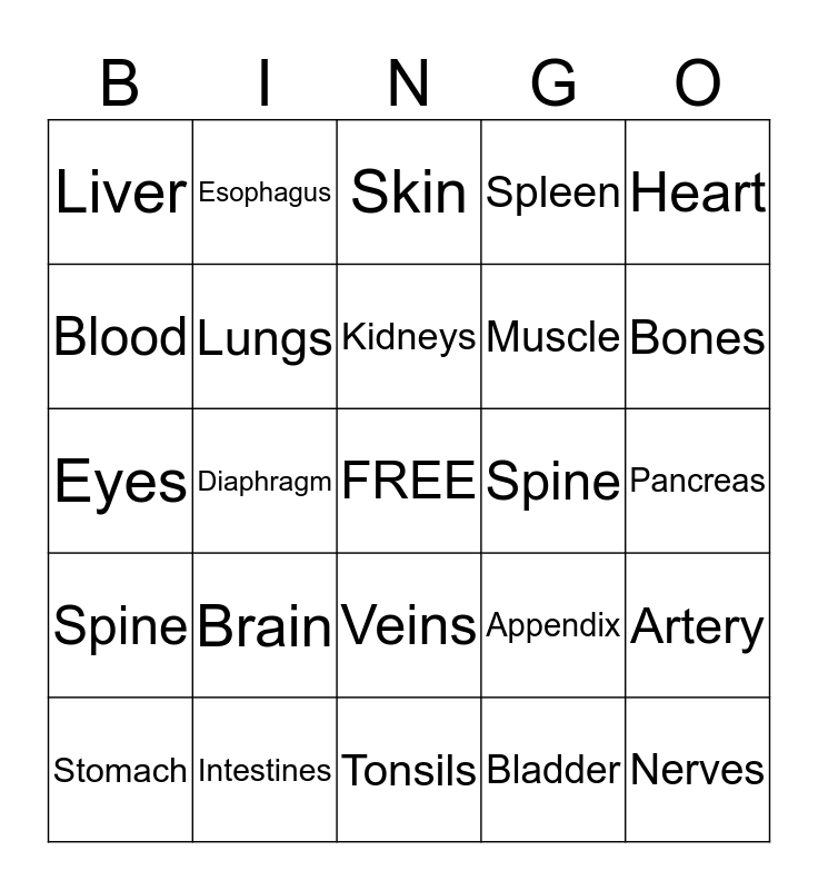 This bingo card has a free space and 24 words: Brain, Intestines, Kidneys, Stomach, Heart, Liver, Blood, Esophagus, Spine, Veins, Muscle, Eyes, Appendix, Artery, Lungs, Bladder, Pancreas, Skin, Bones, Diaphragm, Nerves, Spine, Spleen and Tonsils.