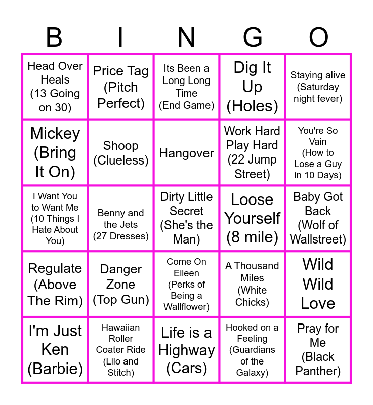 This bingo card has 30 words: Hawaiian Roller Coater Ride (Lilo and Stitch), Almost famous (Tiny Dancer), Benny and the Jets (27 Dresses), Gimme, Gimme, Gimme (Mamma Mia), Head Over Heals (13 Going on 30), Its Been a Long Long Time (End Game), Shoop (Clueless), Come On Eileen (Perks of Being a Wallflower), Loose Yourself (8 mile), Life is a Highway (Cars), Baby Got Back (Wolf of Wallstreet), Dirty Little Secret (She's the Man), Hooked on a Feeling (Guardians of the Galaxy), Pray for Me (Black Panther), You're So Vain (How to Lose a Guy in 10 Days), Perfect Day (Legally Blonde), A Thousand Miles (White Chicks), Regulate (Above The Rim), Danger Zone (Top Gun), Staying alive (Saturday night fever), I Want You to Want Me (10 Things I Hate About You), Purple rain, Price Tag (Pitch Perfect), Work Hard Play Hard (22 Jump Street), Mickey (Bring It On), Dig It Up (Holes), Wild Wild Love, I'm Just Ken (Barbie), Hangover and Ghostbusters.