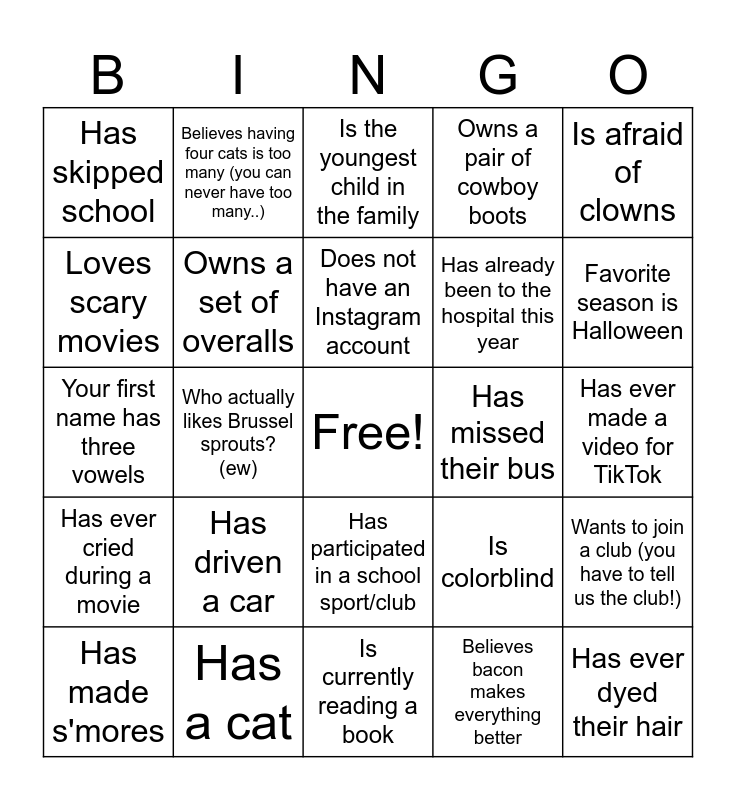 This bingo card has a free space and 24 words: Has driven a car, Has a cat, Does not have an Instagram account, Has made s'mores, Is afraid of clowns, Has skipped school, Loves scary movies, Believes having four cats is too many (you can never have too many..), Has missed their bus, Has participated in a school sport/club, Has already been to the hospital this year, Your first name has three vowels, Is colorblind, Wants to join a club (you have to tell us the club!), Owns a set of overalls, Believes bacon makes everything better, Has ever made a video for TikTok, Is the youngest child in the family, Favorite season is Halloween, Who actually likes Brussel sprouts? (ew), Has ever dyed their hair, Has ever cried during a movie, Owns a pair of cowboy boots and Is currently reading a book.