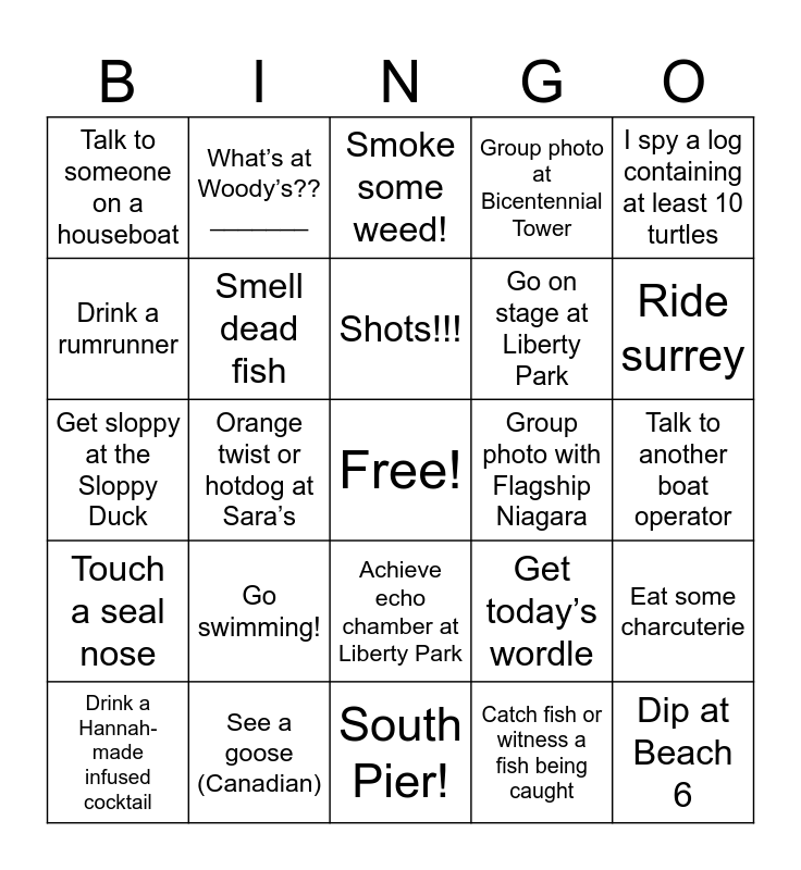 This bingo card has a free space and 24 words: Go swimming!, See a goose (Canadian), Shots!!!, Drink a Hannah-made infused cocktail, I spy a log containing at least 10 turtles, Talk to someone on a houseboat, Drink a rumrunner, What’s at Woody’s?? _______, Group photo with Flagship Niagara, Achieve echo chamber at Liberty Park, Go on stage at Liberty Park, Get sloppy at the Sloppy Duck, Get today’s wordle, Eat some charcuterie, Smell dead fish, Catch fish or witness a fish being caught, Talk to another boat operator, Smoke some weed!, Ride surrey, Orange twist or hotdog at Sara’s, Dip at Beach 6, Touch a seal nose, Group photo at Bicentennial Tower and South Pier!.