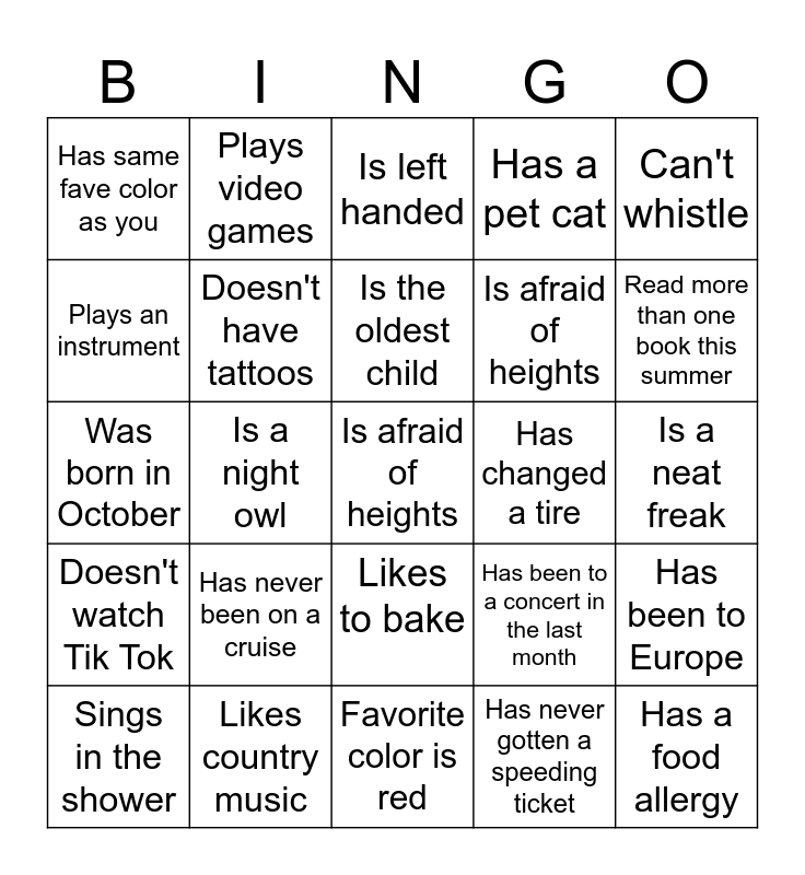 This bingo card has 25 words: Has never been on a cruise, Favorite color is red, Is the oldest child, Sings in the shower, Can't whistle, Has same fave color as you, Plays an instrument, Plays video games, Has changed a tire, Likes to bake, Is afraid of heights, Was born in October, Has been to a concert in the last month, Has been to Europe, Doesn't have tattoos, Has a food allergy, Is a neat freak, Is left handed, Read more than one book this summer, Is a night owl, Is afraid of heights, Likes country music, Doesn't watch Tik Tok, Has a pet cat and Has never gotten a speeding ticket.