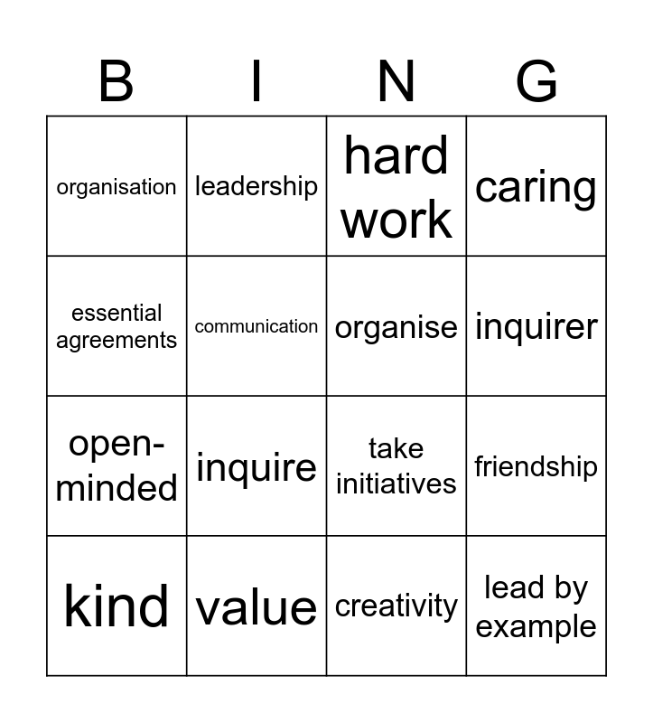 This bingo card has 16 words: value, friendship, hard work, organisation, open-minded, leadership, take initiatives, creativity, essential agreements, communication, kind, caring, inquire, inquirer, organise and lead by example.