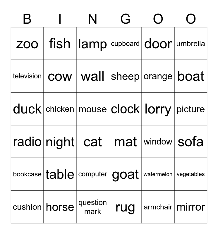 This bingo card has 36 words: goat, computer, rug, television, radio, clock, cow, question mark, door, watermelon, boat, cupboard, vegetables, chicken, sheep, zoo, bookcase, lorry, duck, lamp, mouse, night, mat, cat, window, fish, orange, horse, wall, umbrella, mirror, cushion, sofa, picture, table and armchair.