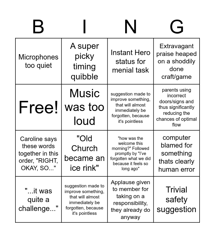 This bingo card has 16 words: suggestion made to improve something, that will almost immediately be forgotten, because it's pointless, computer blamed for something thats clearly human error, Instant Hero status for menial task, Microphones too quiet, Caroline says these words together in this order, "RIGHT, OKAY, SO...", A super picky timing quibble, "how was the welcome this morning?" Followed promptly by "I’ve forgotten what we did because it feels so long ago", Applause given to member for taking on a responsibility, they already do anyway, Free!, Music was too loud, "...it was quite a challenge...", Extravagant praise heaped on a shoddily done craft/game, "Old Church became an ice rink", parents using incorrect doors/signs and thus significantly reducing the chances of optimal flow, suggestion made to improve something, that will almost immediately be forgotten, because it's pointless and Trivial safety suggestion.