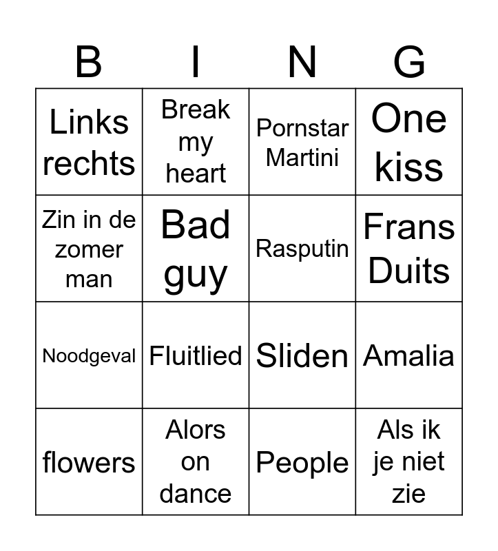 This bingo card has 51 words: Free!, flowers, Ladada, Stay, Savage love, Blinding lights, Break my heart, Don't you worry, Bad guy, Sexy back, Rasputin, One kiss, On the floor, Gangnam style, Just dance, Schultenbrau, Frans Duits, Alors on dance, anne Fleur vakantie, Zin in de zomer man, Amalia, Ik ga zwemmen, Links rechts, Noodgeval, Boot, Hans betaalt de schade, Fluitlied, Ode aan het MBO, Leef, Pornstar Martini, How you samba, Vluchtstrook, Push up, Blijven slapen, Verleden tijd, Amsterdam, Run the World, Single ladies, Ruggengraat, AMG, People, Als ik je niet zie, Simone, Arranca, Stiekem, Layla, Sliden, Nooit meer regen, This year, Ketchupsong and Barbie girl.