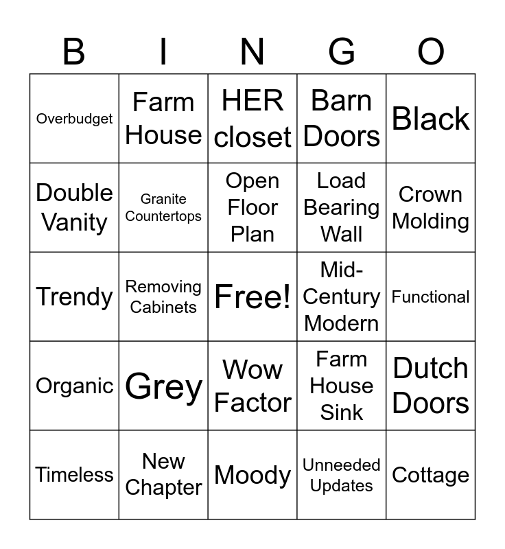 This bingo card has a free space and 51 words: Scandi, Cottage, Shiplap, Moody, Grey, Coastal, Farm House, Pop, Double Vanity, Walk in Closet, Granite Countertops, Barn Doors, Dutch Doors, Farm House Sink, German Smear, Subway Tile, Open Floor Plan, Mid-Century Modern, Gallery Wall, Black, Removing Cabinets, Unneeded Updates, Overbudget, Load Bearing Wall, Turn Key, Vaulted/High Ceilings, Crown Molding, Exposed Brick, Timeless, HER closet, Harring Bone, Demo Day, Island, Bad Plumbing, Dry Wall, New Chapter, Natural Light, Texture, Vibe, Back Splash, Functional, Organic, Movement, Vintage, Dated, En Suite, Trendy, Butcher Block, Vaulted Ceiling, Wow Factor and Rustic.