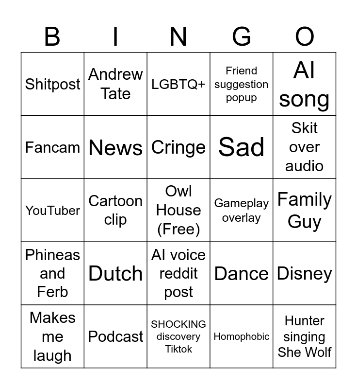 This bingo card has a free space and 24 words: Dutch, Podcast, Cringe, Makes me laugh, AI song, Shitpost, Fancam, Andrew Tate, Gameplay overlay, AI voice reddit post, Sad, YouTuber, Dance, Disney, News, Homophobic, Family Guy, LGBTQ+, Skit over audio, Cartoon clip, Hunter singing She Wolf, Phineas and Ferb, Friend suggestion popup and SHOCKING discovery Tiktok.