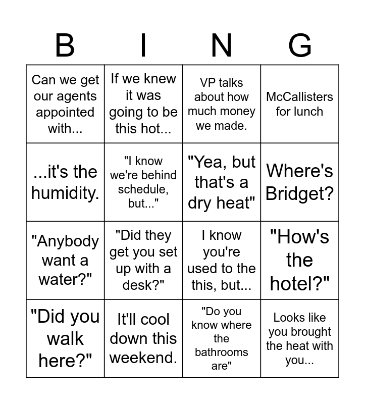 This bingo card has 16 words: It'll cool down this weekend., "How's the hotel?", VP talks about how much money we made., Can we get our agents appointed with..., "Anybody want a water?", If we knew it was going to be this hot..., I know you're used to the this, but..., "Do you know where the bathrooms are", ...it's the humidity., "I know we're behind schedule, but...", "Did you walk here?", McCallisters for lunch, "Did they get you set up with a desk?", Where's Bridget?, "Yea, but that's a dry heat" and Looks like you brought the heat with you....