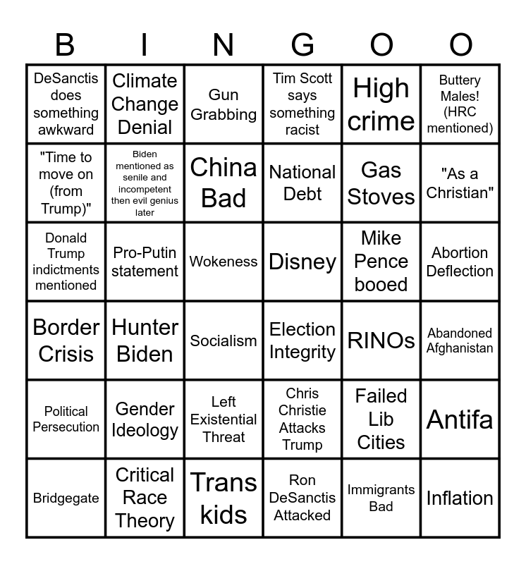 This bingo card has 36 words: Chris Christie Attacks Trump, Left Existential Threat, Ron DeSanctis Attacked, "Time to move on (from Trump)", Border Crisis, Disney, Biden mentioned as senile and incompetent then evil genius later, Trans kids, High crime, Failed Lib Cities, "As a Christian", Tim Scott says something racist, Antifa, Pro-Putin statement, National Debt, DeSanctis does something awkward, Political Persecution, Mike Pence booed, Donald Trump indictments mentioned, Gun Grabbing, Wokeness, Hunter Biden, Election Integrity, Socialism, RINOs, Climate Change Denial, Gas Stoves, Critical Race Theory, China Bad, Buttery Males! (HRC mentioned), Inflation, Bridgegate, Abandoned Afghanistan, Abortion Deflection, Gender Ideology and Immigrants Bad.