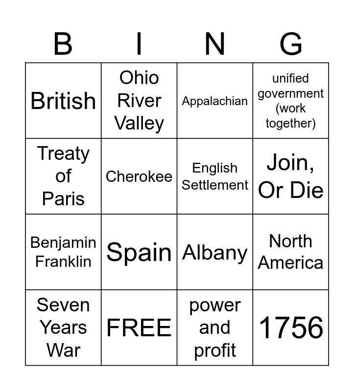 This bingo card has 21 words: FREE, George Washington, Ohio River Valley, French, power and profit, English Settlement, British, Appalachian, Albany, Join, Or Die, Benjamin Franklin, unified government (work together), 1756, Fort Loudoun, Cherokee, fur, Seven Years War, Spain, Treaty of Paris, North America and doubled.