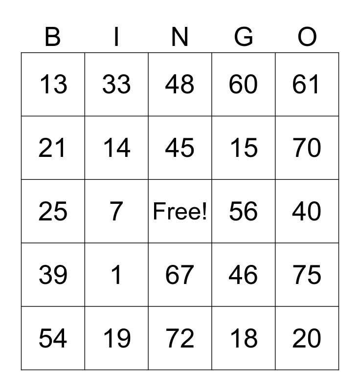 This bingo card has a free space and 24 words: 1, 19, 45, 54, 61, 13, 21, 33, 56, 67, 15, 25, 46, 75, 14, 18, 40, 48, 70, 7, 20, 39, 60 and 72.