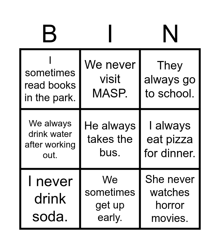 This bingo card has 9 words: I never drink soda., They always go to school., We never visit MASP., We always drink water after working out., I sometimes read books in the park., I always eat pizza for dinner., He always takes the bus., She never watches horror movies. and We sometimes get up early..