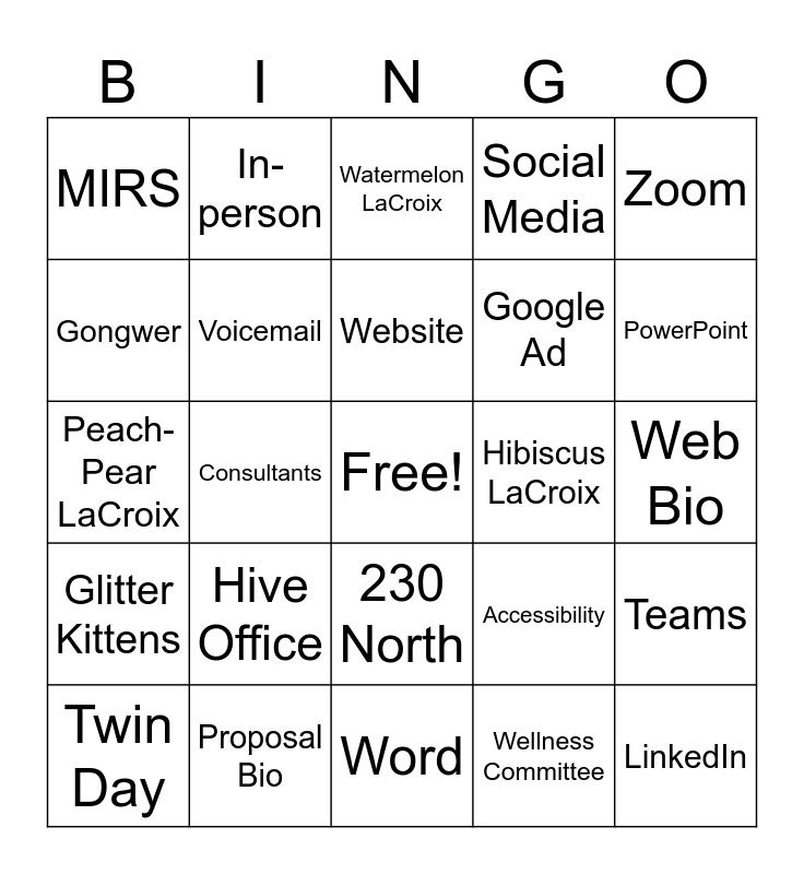 This bingo card has a free space and 32 words: Wellness Committee, Monthly Steps Challenge, Consultants, Cowbell, Glitter Kittens, Voicemail, Zoom, Teams, In-person, Weblink, Website, Watermelon LaCroix, Pro-bono, Lime LaCroix, Hibiscus LaCroix, Blackberry LaCroix, Twin Day, Peach-Pear LaCroix, 230 North, Hive Office, Accessibility, Webinar, Web Bio, Proposal Bio, LinkedIn, Social Media, Google Ad, Gongwer, MIRS, Word, Excel and PowerPoint.