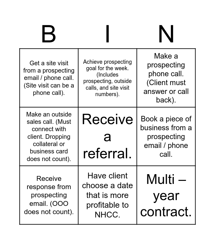 This bingo card has 9 words: Receive response from prospecting email. (OOO does not count)., Make a prospecting phone call. (Client must answer or call back)., Achieve prospecting goal for the week. (Includes prospecting, outside calls, and site visit numbers)., Make an outside sales call. (Must connect with client. Dropping collateral or business card does not count)., Get a site visit from a prospecting email / phone call. (Site visit can be a phone call)., Book a piece of business from a prospecting email / phone call., Receive a referral., Multi – year contract. and Have client choose a date that is more profitable to NHCC..