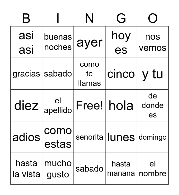 This bingo card has a free space and 24 words: como estas, mucho gusto, como te llamas, hasta la vista, nos vemos, asi asi, gracias, buenas noches, hola, senorita, cinco, diez, lunes, domingo, sabado, hasta manana, de donde es, ayer, y tu, el apellido, el nombre, adios, hoy es and sabado.