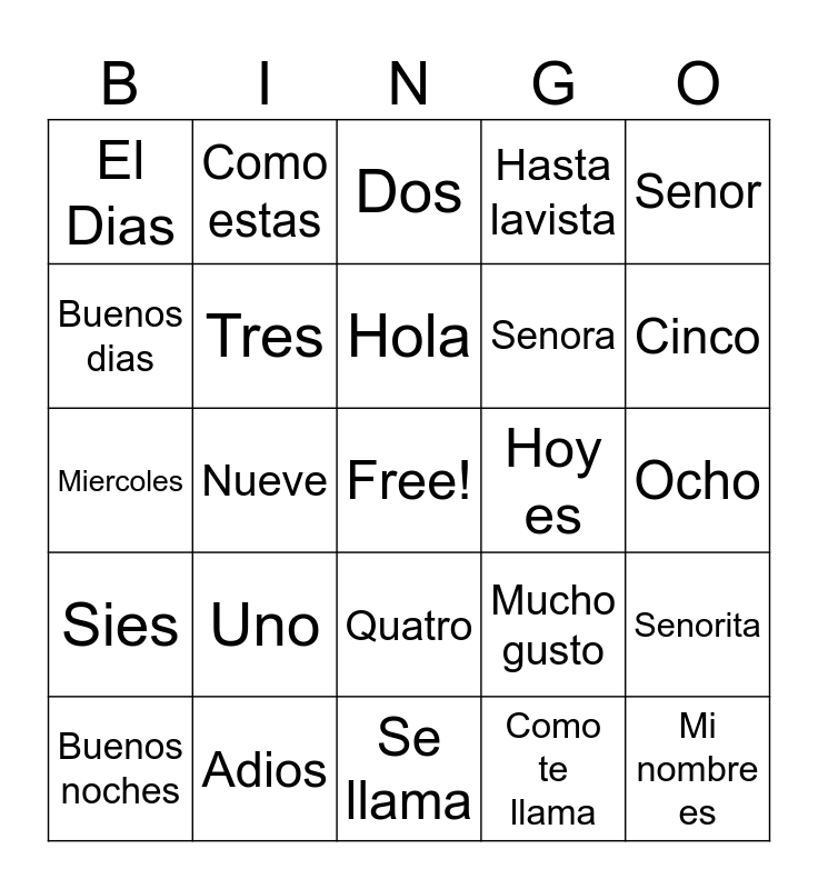 This bingo card has a free space and 24 words: Uno, Adios, Hola, Buenos noches, Senor, El Dias, Buenos dias, Como estas, Hoy es, Quatro, Senora, Miercoles, Mucho gusto, Senorita, Tres, Como te llama, Ocho, Dos, Cinco, Nueve, Mi nombre es, Sies, Hasta lavista and Se llama.