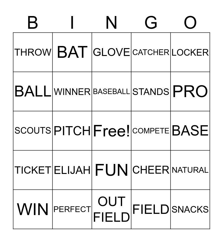 This bingo card has a free space and 24 words: ELIJAH, PERFECT, BASEBALL, WIN, LOCKER, THROW, BALL, BAT, COMPETE, FUN, STANDS, SCOUTS, CHEER, NATURAL, WINNER, FIELD, BASE, GLOVE, PRO, PITCH, SNACKS, TICKET, CATCHER and OUT FIELD.