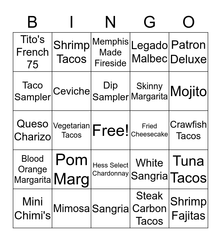 This bingo card has a free space and 24 words: Pom Marg, Mimosa, Dip Sampler, Mini Chimi's, Patron Deluxe, Tito's French 75, Taco Sampler, Shrimp Tacos, Fried Cheesecake, Hess Select Chardonnay, Skinny Margarita, Queso Charizo, White Sangria, Tuna Tacos, Ceviche, Steak Carbon Tacos, Crawfish Tacos, Memphis Made Fireside, Mojito, Vegetarian Tacos, Shrimp Fajitas, Blood Orange Margarita, Legado Malbec and Sangria.