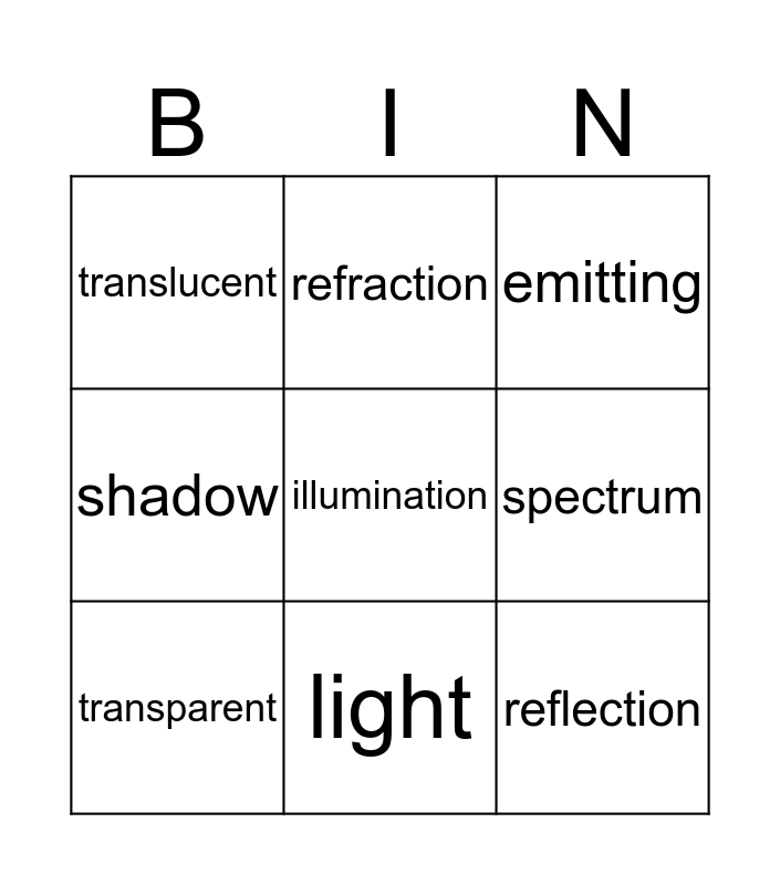 This bingo card has a free space and 8 words: spectrum, emitting, refraction, transparent, translucent, reflection, shadow and light.