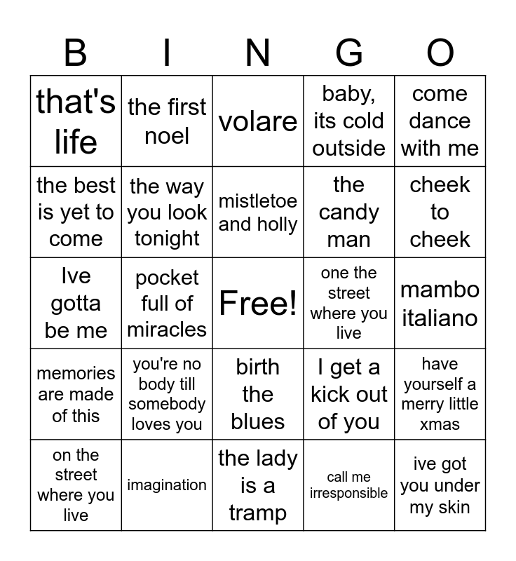 This bingo card has a free space and 29 words: on the street where you live, one for my baby, pocket full of miracles, that's amore, that's life, volare, the way you look tonight, you're no body till somebody loves you, one the street where you live, imagination, mambo italiano, ive got you under my skin, the lady is a tramp, call me irresponsible, cheek to cheek, come fly with me, birth the blues, memories are made of this, come dance with me, Ive gotta be me, I get a kick out of you, I get a kick out of you, the candy man, the best is yet to come, baby, its cold outside, the first noel, have yourself a merry little xmas, mistletoe and holly and let it snow.