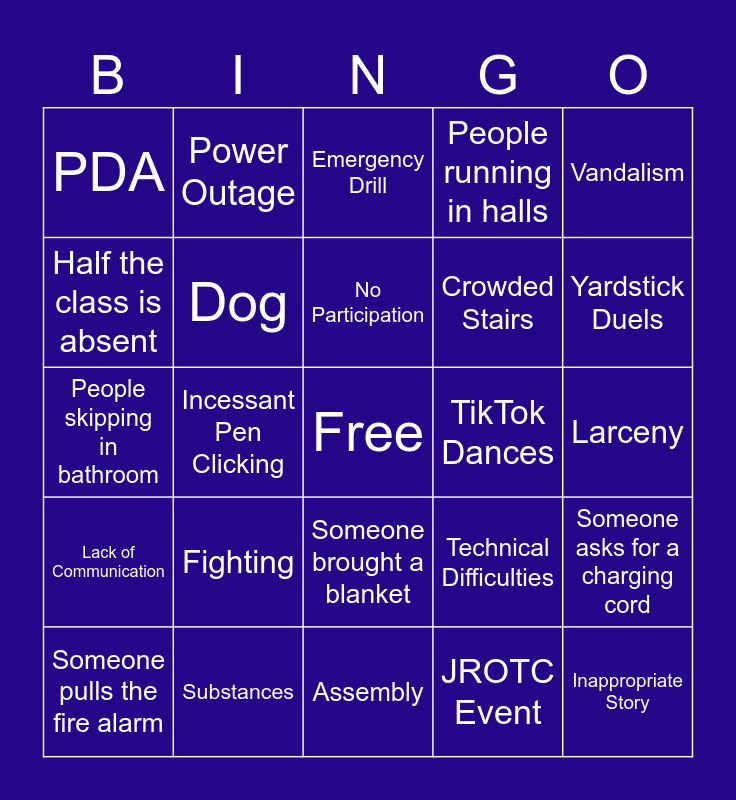 This bingo card has a free space and 24 words: Fighting, Substances, No Participation, Someone pulls the fire alarm, Vandalism, PDA, Half the class is absent, Power Outage, TikTok Dances, Someone brought a blanket, Crowded Stairs, People skipping in bathroom, Technical Difficulties, Someone asks for a charging cord, Dog, JROTC Event, Larceny, Emergency Drill, Yardstick Duels, Incessant Pen Clicking, Inappropriate Story, Lack of Communication, People running in halls and Assembly.