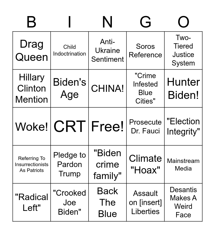 This bingo card has a free space and 24 words: Pledge to Pardon Trump, "Crooked Joe Biden", CHINA!, "Radical Left", Two-Tiered Justice System, Drag Queen, Hillary Clinton Mention, Child Indoctrination, Prosecute Dr. Fauci, "Biden crime family", "Crime Infested Blue Cities", Woke!, Climate "Hoax", Mainstream Media, Biden's Age, Assault on [insert] Liberties, "Election Integrity", Anti-Ukraine Sentiment, Hunter Biden!, CRT, Desantis Makes A Weird Face, Referring To Insurrectionists As Patriots, Soros Reference and Back The Blue.
