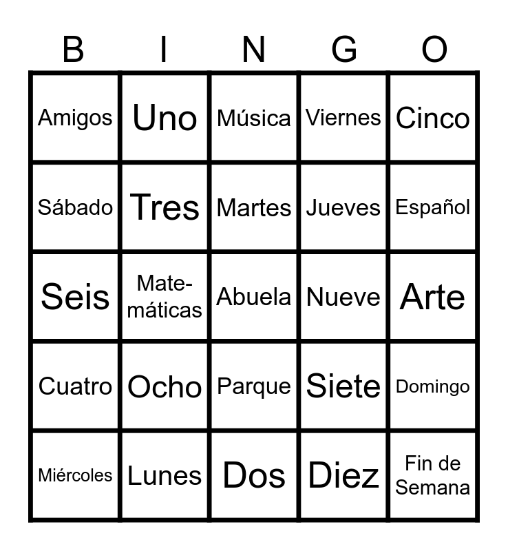 This bingo card has a free space and 24 words: Ocho, Lunes, Martes, Miércoles, Cinco, Amigos, Sábado, Uno, Nueve, Parque, Jueves, Seis, Siete, Domingo, Tres, Diez, Arte, Música, Español, Mate-máticas, Fin de Semana, Cuatro, Viernes and Dos.